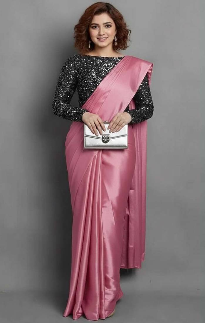 • Saree : Color- Pink / Fabric- Satin • Blouse : Color- Black / Fabric- Velvet Saree Details