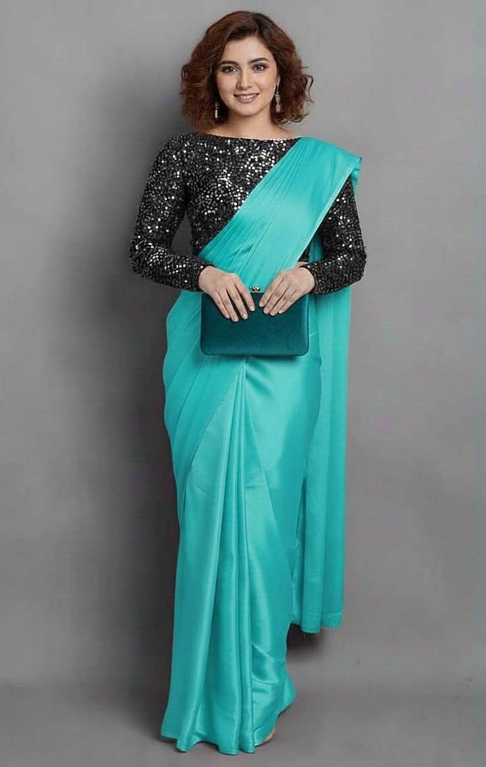 • Saree : Color- Aqua Blue / Fabric- Satin • Blouse : Color- Black / Fabric- Velvet Saree Details
