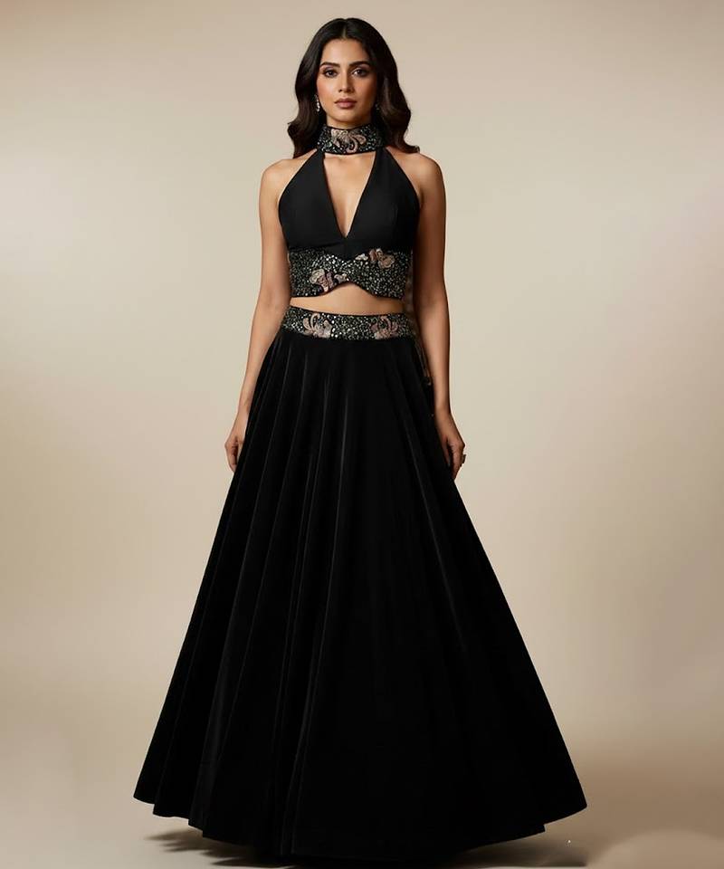Rich Velvet In Classic Black Creates A Luxurious Lehenga Set Enhanced By Intricate Embroidery. The Plush Texture Adds Depth And Warmth, Making It Ideal For Winter Weddings And Evening Events. Bold Yet Elegant, This Outfit Delivers Regal Charm With A Dramatic, Statement-Making Presence.
