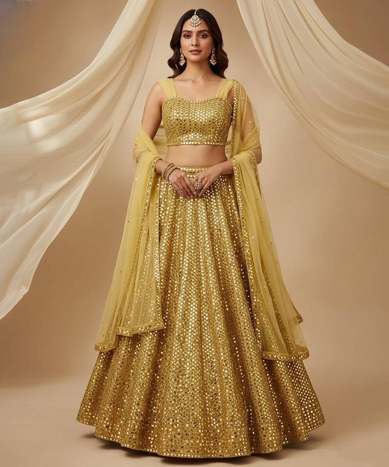 Shimmering Gold Tones And Delicate Embroidery Make This Georgette Lehenga Set Truly Eye-Catching. The Lightweight Fabric Flows Gracefully, Adding Movement And Elegance. Perfect For Weddings And Grand Celebrations, This Ensemble Offers A Radiant Look With Timeless Festive Appeal And Feminine Sophistication.